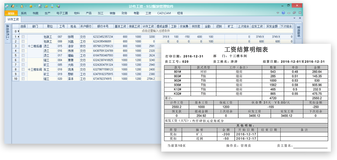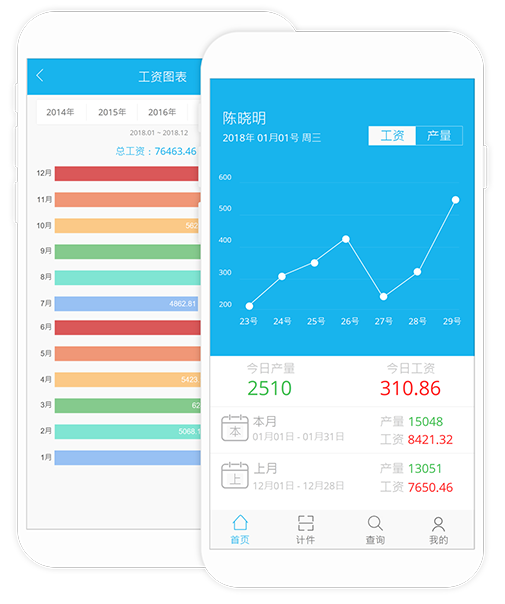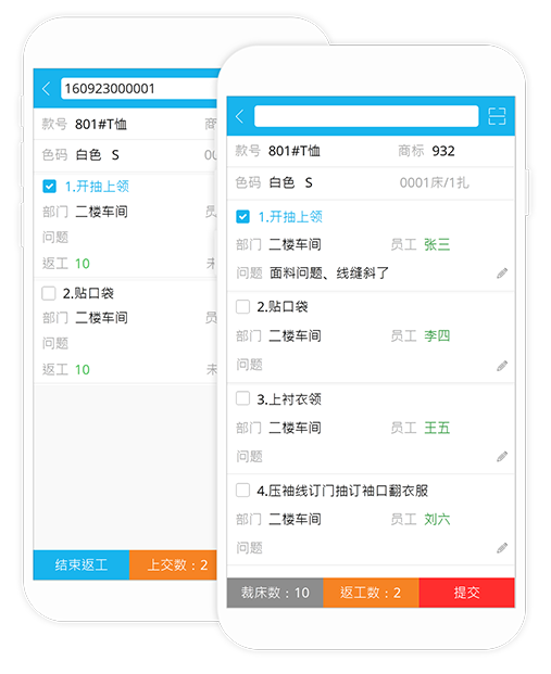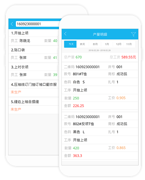 实时查看:员工产量、生产进度、裁片流向、客户进度、返工情况,自动计算每位员工的工资。